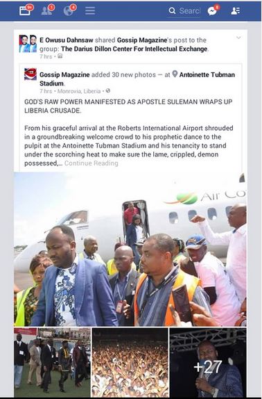 A Liberian man, Owusu Dahnsaw has reported the explosive crusade of popular Nigerian Pastor and General overseer of Omega ministries - Johnson Suleman outside Nigeria. Read his words... From his graceful arrival at the Roberts International Airport shrouded in a groundbreaking welcome crowd to his prophetic dance to the pulpit at the Antoinette Tubman Stadium and his tenancity to stand under the scorching heat to make sure the lame, crippled, demon possessed, blind, deaf and dumb receive their healing from God through him: it is clear that Apostle Johnson Suleman is backed by 'God's Raw Undiluted Power' to save, heal and restore.